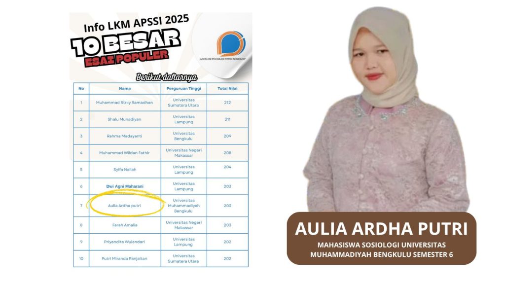 Kabar membanggakan datang dari Program Studi Sosiologi, Fakultas Ilmu Sosial dan Ilmu Politik, Universitas Muhammadiyah Bengkulu. Salah satu mahasiswinya, Aulia Ardha Putri, berhasil masuk dalam 10 besar nasional lomba esai populer yang diselenggarakan oleh Asosiasi Program Studi Sosiologi Indonesia (APSSI) pada ajang Lomba Karya Mahasiswa APSSI 2025.